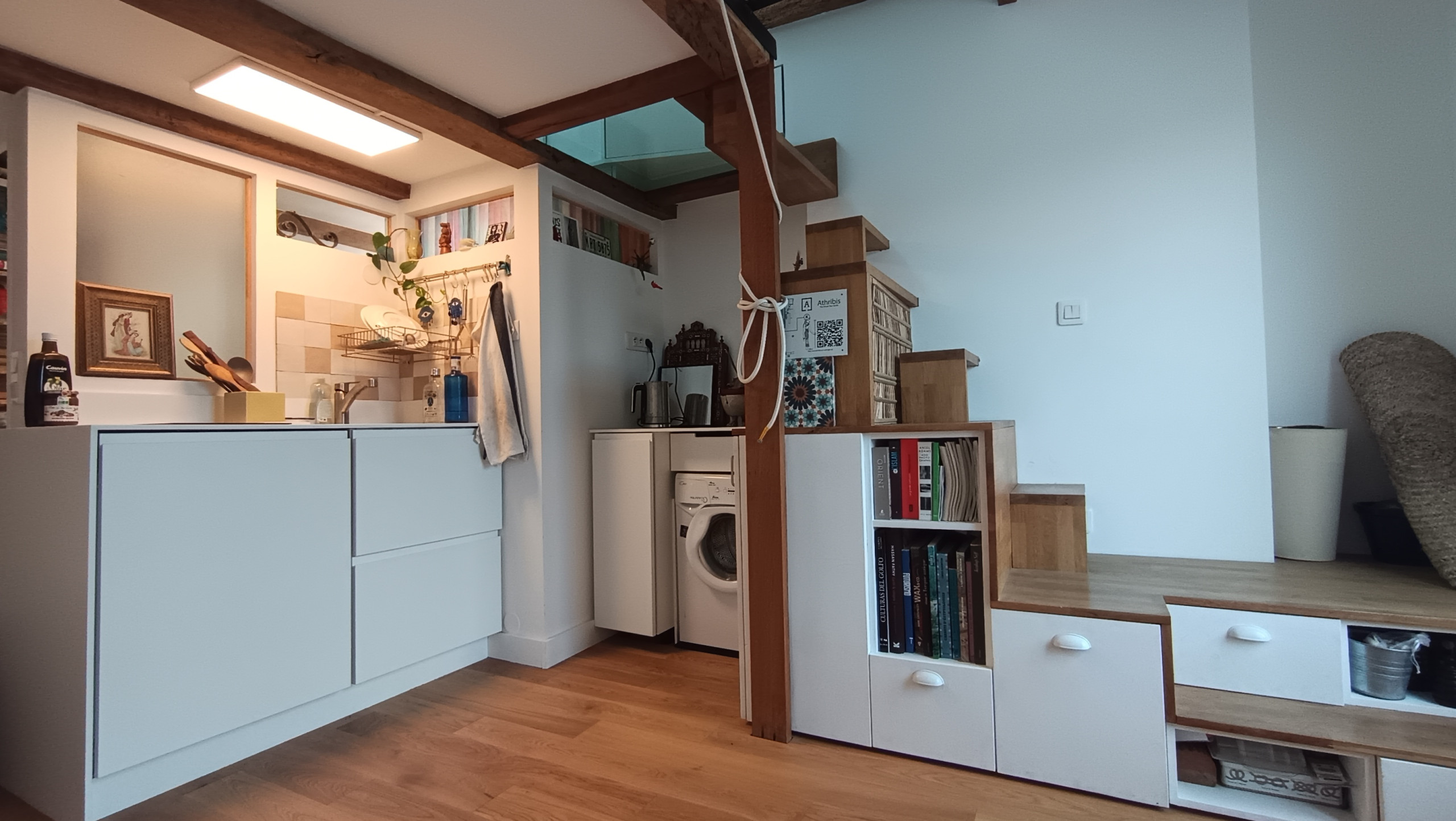 La cuisine ouverte et spacieuse est entièrement équipée : plaques de cuisson, réfrigérateur, micro-ondes, congélateur, air fryer, appareil à raclette et crêpière. (À noter : il n’y a pas de machine à café ni de bouilloire.)
